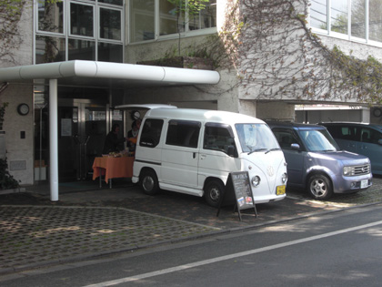 平日。この社屋入り口前には、小平市の洋食屋さんがお弁当を積んだライトバンでやってきて店を開いているようです。