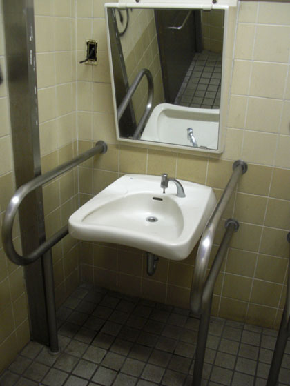 中央入り口前にも左右手すりのついた洗面台が1つあり、