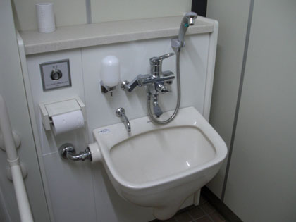 このトイレにはオストメイト専用便器が設置されているので、利用者の中にはこちらの水栓で手を洗う人が少なからずいるような気がします。