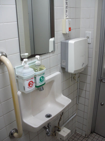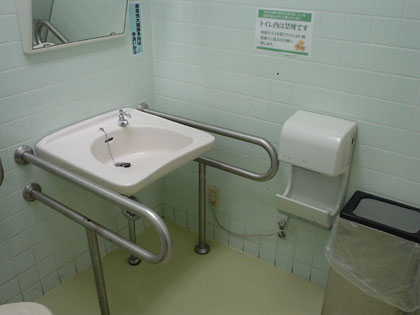 多目的トイレは洗面台で液体石鹸も用意されていますが、エアータオルは設置されていませんでした。