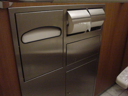 多目的トイレの洗面台には液体石鹸、一般トイレと違いコチラのトイレにはエアータオルの代わりに紙タオルが設置されています。
