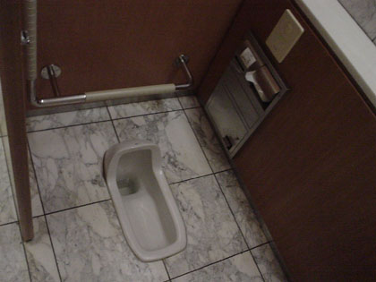 和式トイレの手すりは大きな“L”字型で、長時間ガンバル時も有効に活用できましょう。