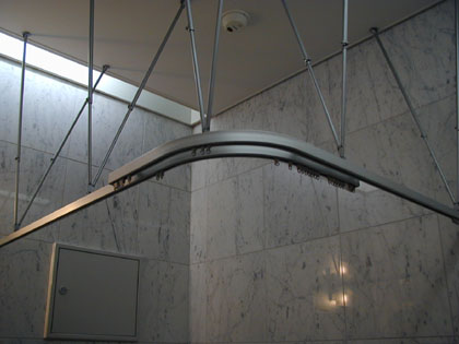 ここ1階多目的トイレには、付き添い人と利用者の間を仕切るエチケット――目隠し用のカーテンレールが設置されていますが、肝心のカーテンは設置されていません。