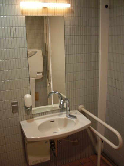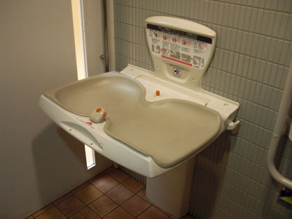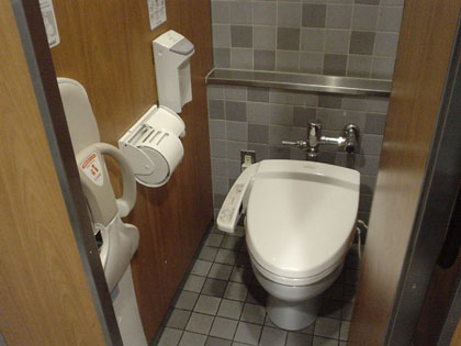 オムツ台やベビーキープなどほかに装備が場所を取っていても、300メートル東の多目的トイレのような手狭さをここの多目的トイレには感じません。