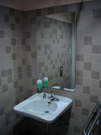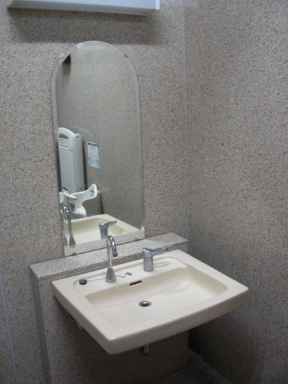 洗面台に設置されている液体石鹸用のキープボトルは空っから・・・・・・私の嗅覚に石鹸の香りもしないことから、多目的トイレも一般用トイレと同じ、デフォルトで石鹸が準備されていないようで残念至極。