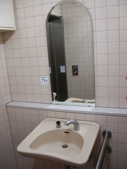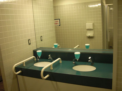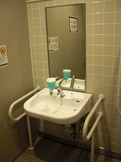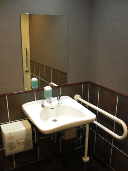 多目的トイレの洗面台にも液体石鹸が用意されているのは良い点ですが、