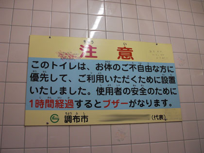 多目的トイレ内の注意書きによると、1時間トイレにこもっていると使用者の安全を考慮して自動で警報を鳴らすようです。