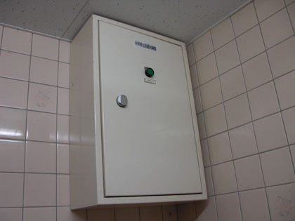 緑色の「警報復旧ボタン」を備えた警報装置の制御盤があるのですが、ちょっとその位置が高すぎて間違えて警報ボタンを押してしまった場合の復旧、警報音を止める事はほぼ不可能なので、その取り扱いには注意しましょう。
