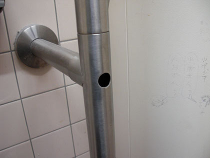 足を滑らした、また膝に力が入らない態勢を崩した咄嗟の刹那、無意識に伸ばした手で掴む場所がこの取っ手となります。もしこの穴に指のどれかが一本でも入り・・・そのまま態勢を崩したりしたら・・・・・・ただのケガじゃすまない場合もでてきます。大事が起こらないうちにこの穴は即効塞ぐべきでしょう。