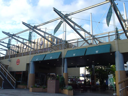 正面ゲートそばに建つ飲食施設「ポケットガーデン」の