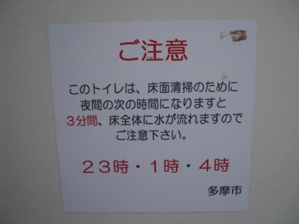 「夜間の次の時間になりますと3分間、床全体に水が流れますのでご注意ください」