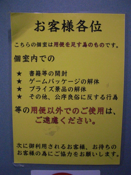 買ったモノの内容や傷や欠損の有無を確認したり、取り出して中身の無い空箱潰したり、家までガマンできずに鼻息も荒く読書したりする場所ではありませんぜダンナぁ