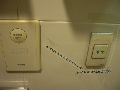 3階トイレの緊急ボタンには、わざわざ矢印の誘導書きがついています。