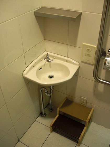 多目的トイレを兼ねる3階と5階の個室トイレの洗面台には液体石鹸はついていませんが、子供用踏み台はどちらの階の個室にも用意されています。