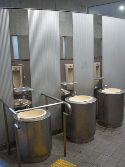 さすがはグッドデザイン賞を貰うぐらいの駅舎のトイレですからね、と褒めたいところですが、流石に時を経たせいかアルミボディにかなりの汚れが目立ちます。