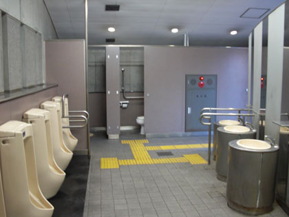 入り口から真っ直ぐと伸びる点字ブロックが、手すり付きの洋式トイレ、手すり付きの小用トイレ、手すり付き洗面台への誘導を行っています。