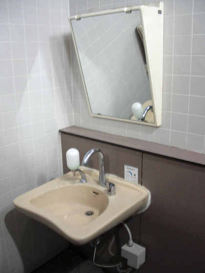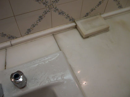 洗面台に残るその遺物から、昔は固形石鹸が常備されていたことが窺えます。