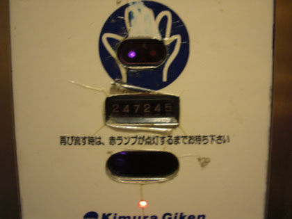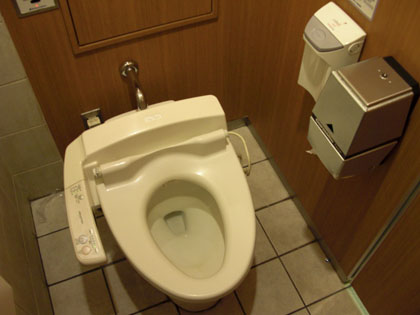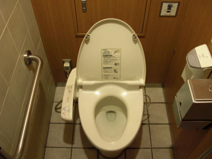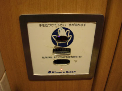 ここの個室トイレの洗浄はタッチ&自動センサー方式でして、わざわざ手でセンサー部に触れずとも、利用者が便器から離れれば自動で水が流れる仕組みです。