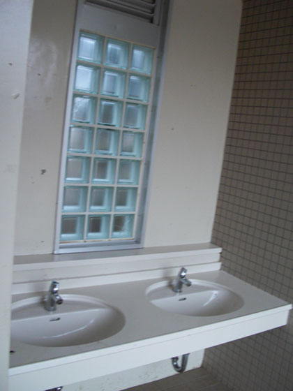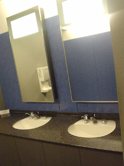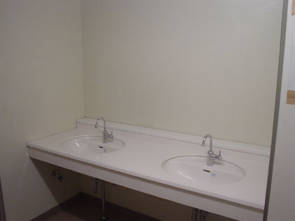 男性用トイレの入り口と女性用トイレの入り口との間に共用の洗面台。