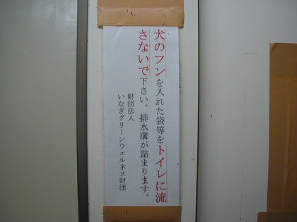 「犬のフンを入れた袋等をトイレに流さないで下さい。排水溝が詰まります」