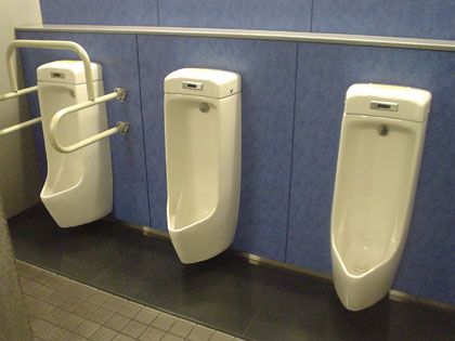一般男性用トイレの洗浄は背中のレバー式でしたが、こちらは壁のセンサー式。