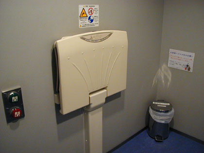 各階の多目的トイレにはオムツ台が設置されており、換えのオムツを捨てるための密閉型ゴミ箱がキチンと用意されている点はとてもとてもグッドです。