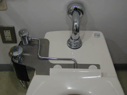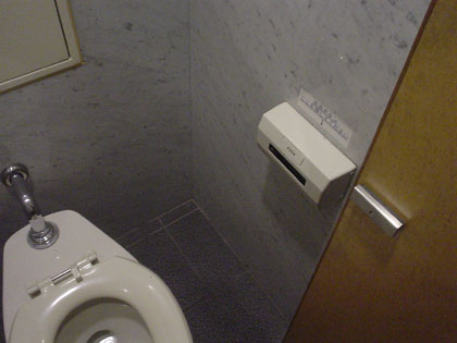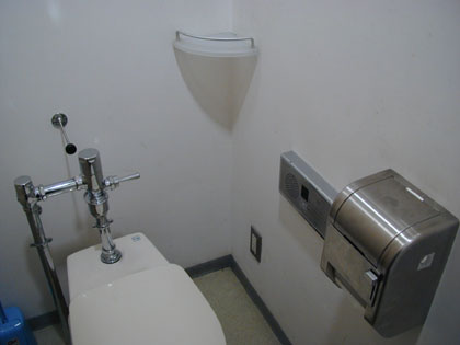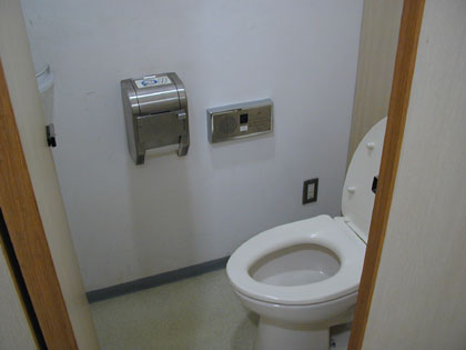 この施設の個室トイレには、男性用にも擬似流水音発生装置“音姫”がデフォルトで設置されていたりします。