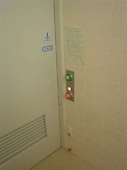 「開」「閉」ボタン式の多目的トイレのドアは、内側の「閉」ボタンを押すと、「開」と「閉」ボタンの間にある「使用中」のランプ」が点灯、トイレ外側の「開」ボタンではドアが開かなくなります。