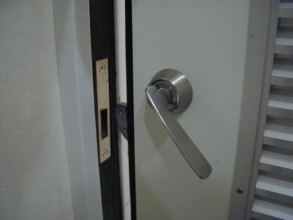 ドアのレバーを下に下げると、反りのあるデッドボルトが飛び出、ストライクの穴の上部に引っ掛かり施錠されるタイプのドアです。