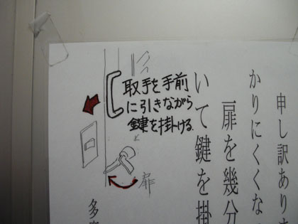 それでかからなければ、ドアを奥(外側)に押してから鍵をかけてみます。