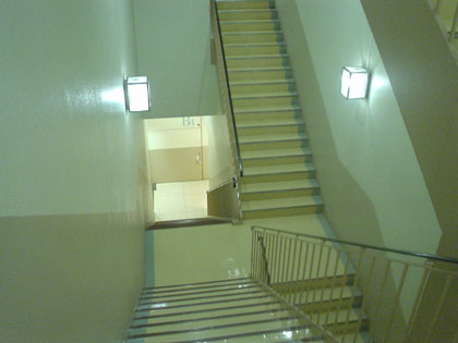 男性用および女性用のトイレが設置されているフロアでは、この階段の両脇で男女のトイレが分けられて設置されています。