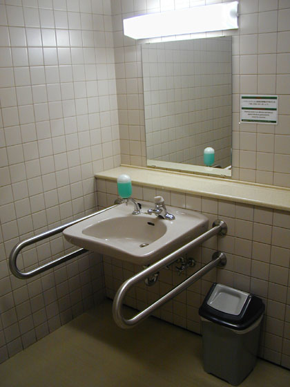 多目的トイレの洗面台にも液体石鹸が用意され、