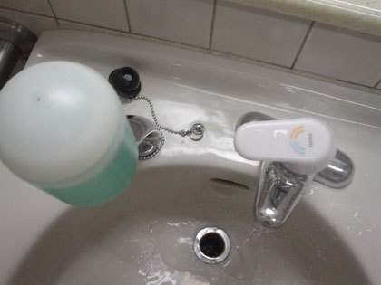 洗面台の水はセンサー式でお湯が出ますが、液体石鹸の噴射器はプッシュ式。