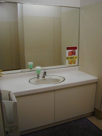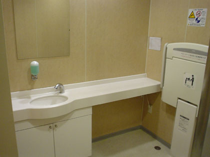 多目的トイレの外には、オムツ台と液体石鹸付きの洗面台が置かれたオムツ交換専用スペースが用意されています。