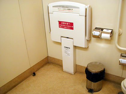 多目的トイレにはオムツ台が設置されており、それ専用の蓋付きゴミ箱がついているほか、オムツの取替えに便利な位置にトイレットペーパーホルダーが設置されているのは配慮っすねぇ。