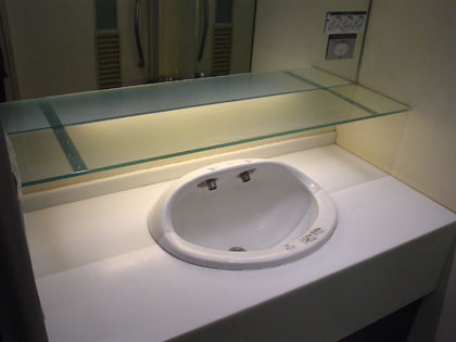 棚に隠れ洗う手先が見えなくならないように、棚には曇りガラスを採用。