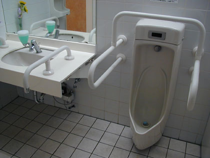 小用トイレの並び、その一番奥に手すり付き小便器が設置されています。