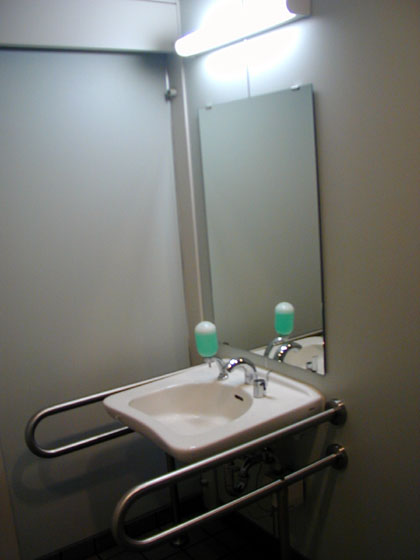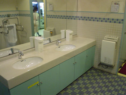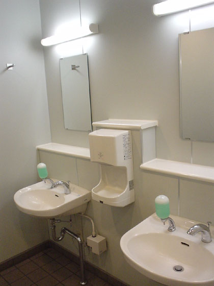 トイレの洗面台にはエアータオルと、洗面台の上にセンサー式の泡石鹸――これってゲーセンでよく見かけますねぇ。