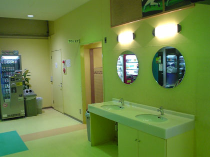 ゲームセンターとバッティングセンターの間の休憩スペースにトイレが設置されています。