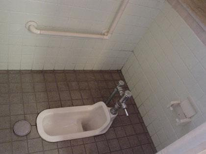 手すりがついただけの和式トイレ。紙は置いてありません。