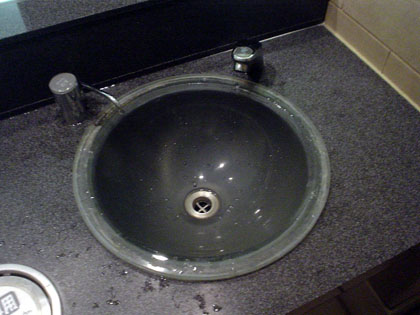 プッシュボタンで水が出る洗面台には石鹸も鏡もついていませんが、