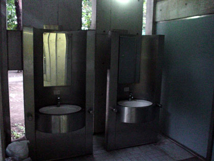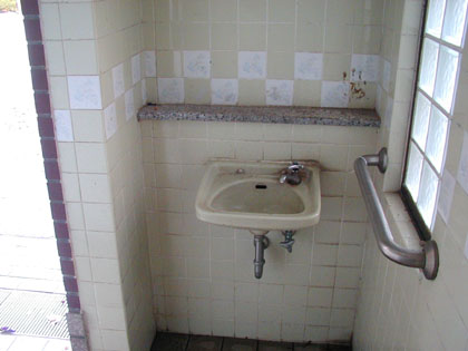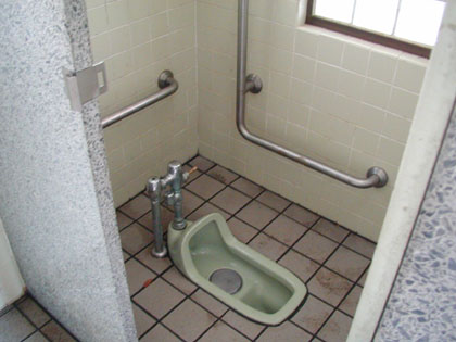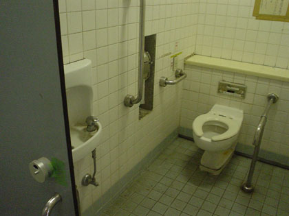 いわゆる男女別の多目的トイレですね。中は和式トイレよりちょっとだけ大きめで、壁に小さな手洗いがついています。