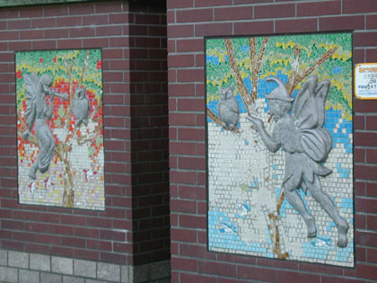 貼られた水色と赤色のタイル画で示されています。