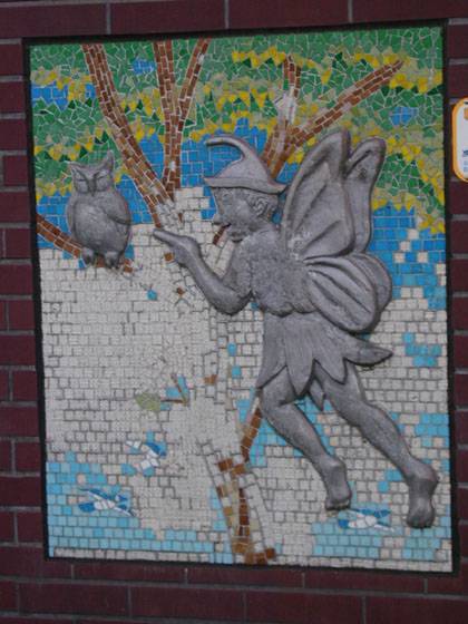 壁に描かれたその別は、森に住む男女の妖精のオブジェと