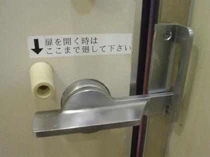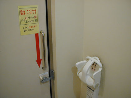 ここの多目的トイレには、他の多目的トイレの同錠ではあまりお目にかからないストッパーがついていました。