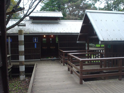 森の小屋のトイレは3つの小屋からなり、上の写真右が多目的トイレ。正面が一般男性用トイレ。正面左手写真の外に一般女性用トイレがあります。