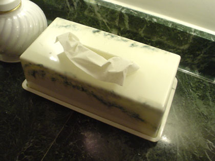 ティッシュ箱も洗面台も、トイレの壁もその床もみんなマーブル模様の大理石。