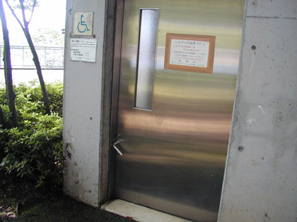 この多目的トイレの入り口のドアは、とても低い位置に配慮されていますな。