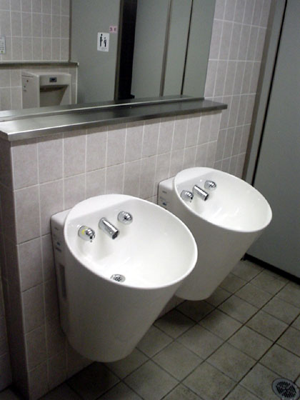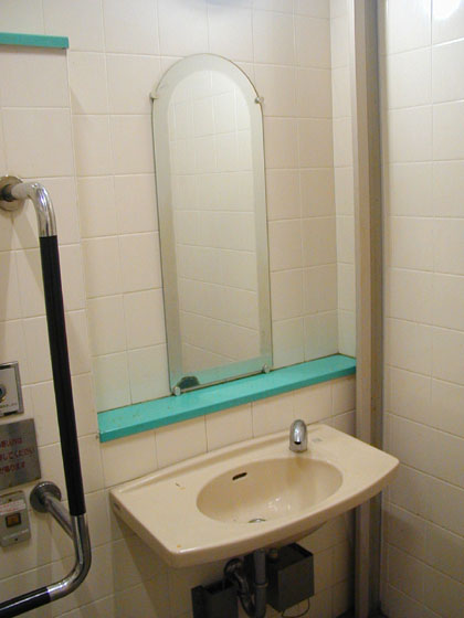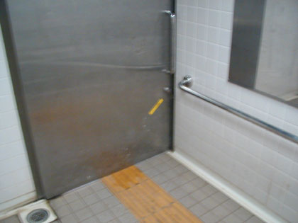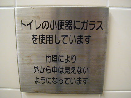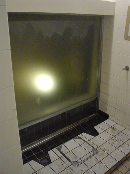 小用トイレはかけ流しタイプ。ステンレスの一枚板が壁にハメ込まれておりました・・・・・・と、頭からそう思い込んでおりましたが、東府中市の住人さんの指摘があって初めてこれがガラス窓だということに気がつかされました。