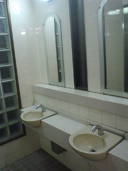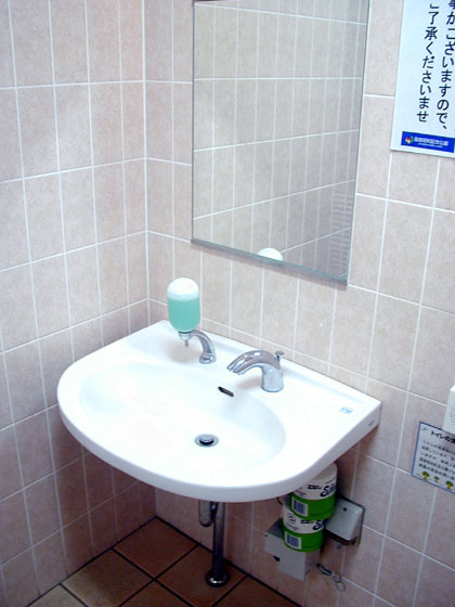 ここの洗面器具は温度調節ツマミ(右)のついたドラムタイプのお洒落なヤツですが、その水の温度を調節することはできないようです。また何度か日を置いてこのトイレを利用しましたが、石鹸(左)も出ないようです。